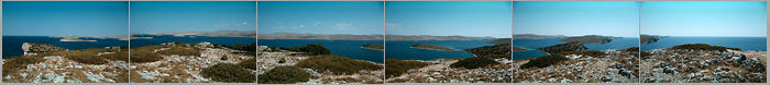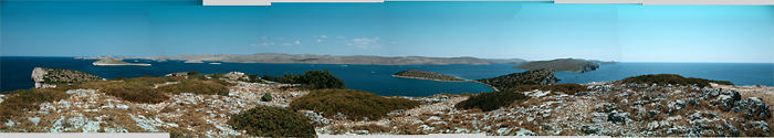 Panorama z wysepki Rasip - na wprost największa wyspa Kornat, najbliższa z lewej to M. Rasip, a z prawej Piskera.