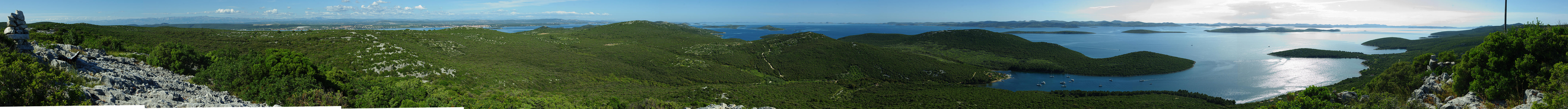 A42. Panorama 350° - Wyspa Pasman (Chorwacja) Chorwacja, wyspa Pasman - widok z góry Tibolj (173m n.p.m.) nad zatok? Soline. Od lewej: w oddali miateczka Turanj, Sveti Filip i Jakov, Biograd na Moru, zatoka Soline z jachtami - maj 2013 |