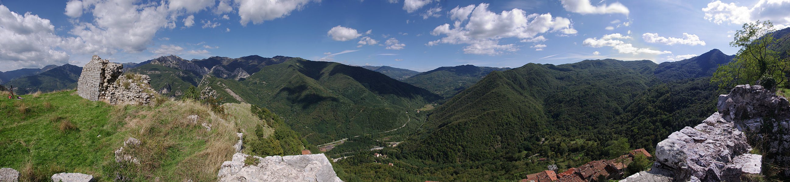 T39. Panorama - Z La Rocca w Lucchio (Włochy) Włochy, Toskania, Prowincja Lukka. Widok w kierunku południowo-wschodnim z ruin twierdzy La Rocca z XI wieku, leżących nad wioską Lucchio (780m n.p.m.). Poniżej widoczne dachy Lucchio a w dole wije się droga SS12. |