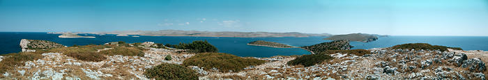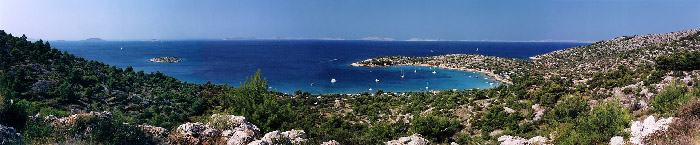 Panorama z wysepki Rasip - na wprost największa wyspa Kornat, najbliższa z lewej to M. Rasip, a z prawej Piskera.