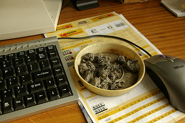 Jest początek 2009. roku i za oknem w końcu pojawiła się prawdziwa zima, zasypując ogród białym puchem. W nocy temperatura spadła poniżej -22oC i powstała piękna szadź. Zamiast iść do pracy trzeba było zabrać sprzęt i zrobić wypad w teren. Gdy się w końcu zdecydowałem i wcześniej skończyłem pracę (a świeciło od rana), to natychmiast pokazały się chmury i zaczęło sypać, jakby nie mogło to poczekać do jutra. Zamiast szadzi zrobiliśmy z Agatą kilka ekstremalnych zdjęć i teraz, w ciepłym domu, kończę wygładzanie kartek, poprawiam literówki, wstawiam i usuwam kropki i przecinki. I tak z pewnością znajdzie się sporo nie w tych miejscach co trzeba. Przy okazji zastanawiam się, co przeoczyłem, i ile czasu tak naprawdę to trwało. Gdybym wiedział czym to się skończy, to pewnie na bieżąco robiłbym notatki i nie czekał na jutro ze zdjęciami. Co zostało po sowach? Zostały wspomnienia niesamowitych przeżyć. Została na pewno Wiosenna historyjka z uszami. Została też rzeczywista i namacalna pamiątka leżąca obok klawiatury: ![]() |